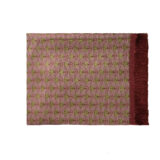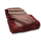 Jakarlı dokuma kumaştan üretilen bu masa örtüsü, bordo saçak bordürüyle şık bir görünüm sunar.